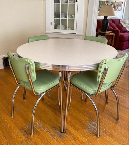 Choose the size of your table and the number of chairs and we do the rest! The chairs come in Sage with Sage piping and 2" seats. The table top comes in Retro Friendly Beige with a 1.25" or 2.25" metal edge. Standard set: 48" Round with 2.25" metal edge and 4 chrome legs, and 4 diner chairs.