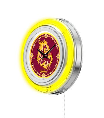 Our Arizona State Classic Logo Neon Clock 15" features a chrome casing and a neon ring that accents the clock face, lit by a brilliant white, inner neon ring. The neon ring is easily turned on and off with a pull chain on the bottom of the clock. Accurate quartz movement is powered by a single, AA battery (not included).