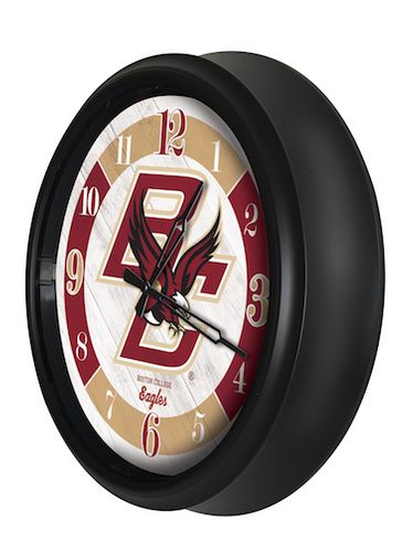 The Boston College Outdoor LED Clocks are made to handle the outside environment. The casing is made from a UV resistant black ABS plastic and the glass face lens has a rubber gasket to seal the weather from the inner clock housing. Four LED lights are controlled by a photo eye, turning on automatically when dark to illuminate the clock face. Logo is digitally printed with UV inks to ensure years of fade free, vibrant colors. Powered by a single AA and 4 D batteries (not included).