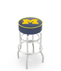 Our Michigan NCAA logo Bar Stools are 100% American Made with chrome plated steel frames, a thick cushion with ribbed chrome accent ring and glides to protect your floors.